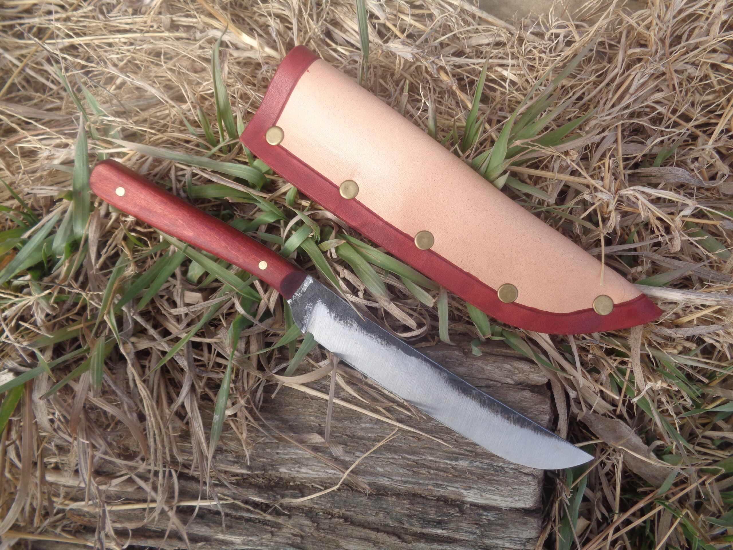 This one-of-a-kind knife is one of our artisan hand-forged knives. It is handmade out of 1065 steel with a propane forge and good old-fashioned hammer. The micarta handle and bi-color leather sheath are custom and handmade to fit this knife.