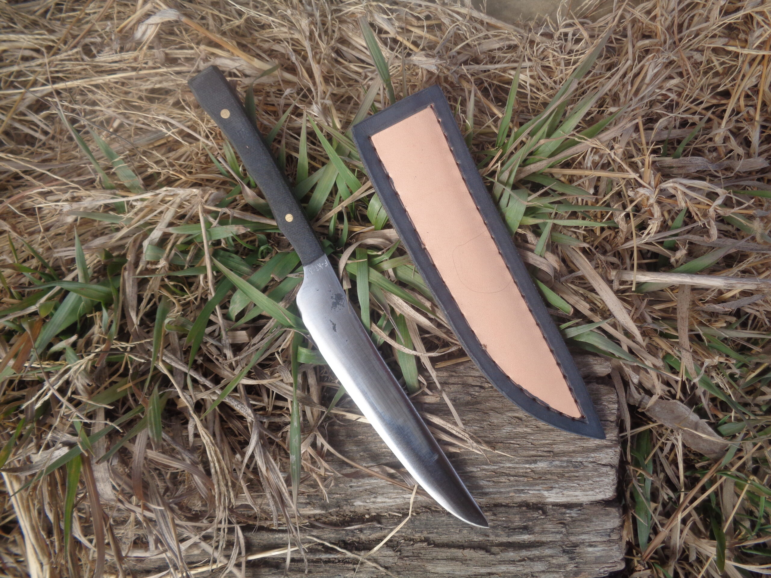 This one-of-a-kind knife is one of our artisan hand-forged knives. It is handmade out of 1065 steel with a propane forge and good old-fashioned hammer. The micarta handle and bi-color leather sheath are custom and handmade to fit this knife.