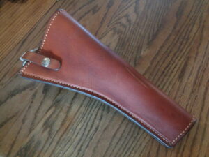 This large brown holster measures 11 inches in length, and will fit a large frame revolver. The snap-close allows easy access. The leather is thick and sturdy, with neat machine stitches for a durable holster. A great holster for anyone who wants to add an authentic vintage style to their revolver.