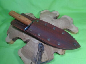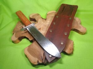 This knife was remade from an USA-made Robeson knife manufactured in the 1930s-1940s. The blade is high carbon steel, forged and tempered, and was reshaped while the handle, guard, and sheath are all custom-made in house.