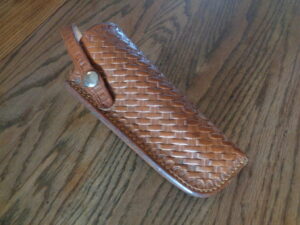 This neat vintage brown leather holster features a stamped basket weave pattern with a snap close. Made in Seattle, WA by The Walkers Brand Company, this sturdy holster will fit a 357 Colt Revolver. The back is stamped “The Walkers Seattle 22, 357 Colt”.